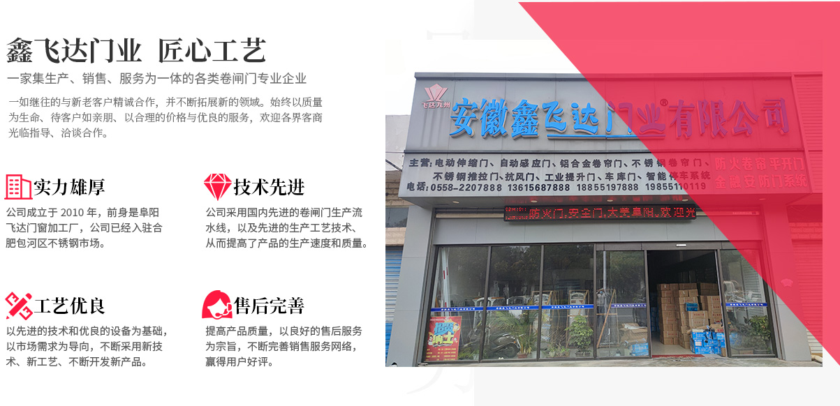 - 安徽鑫飛達(dá)門業(yè)有限公司成立于1998年,前身是阜陽飛達(dá)門窗加工廠,現(xiàn)在公司已經(jīng)入駐合肥包河區(qū)不銹鋼市場。本公司是一家集生產(chǎn)、銷售、服務(wù)為一體的各類卷閘門專業(yè)企業(yè)。公司采用國內(nèi)先進(jìn)的卷閘門生產(chǎn)流水線,以及先進(jìn)的生產(chǎn)工藝技術(shù)、從而提高了產(chǎn)品的生產(chǎn)速度和質(zhì)量。旗下?lián)碛酗w達(dá)九州和飛達(dá)門業(yè)兩個(gè)注冊商標(biāo)。 產(chǎn)品種類齊全 ,質(zhì)量可靠,主要有不銹鋼推拉門,防火卷簾門,電動卷...